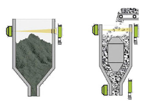 帶有兩個檢測塊組件的類型: 在料罐行走過程中,當(dāng)料罐經(jīng)過料位檢測區(qū)域, 即可測量料罐內(nèi)料位高度。 |